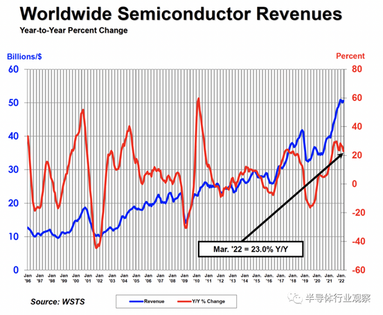 半導體行業(yè)協(xié)會 (SIA) 統(tǒng)計數據顯示,2022年第一季度全球半導體銷售額達到 1517億美元,較去年同期增長23%。但比2021年第四季度低0.5% 。2022年3月全球銷售額為506億美元,環(huán)比增長1.1%。